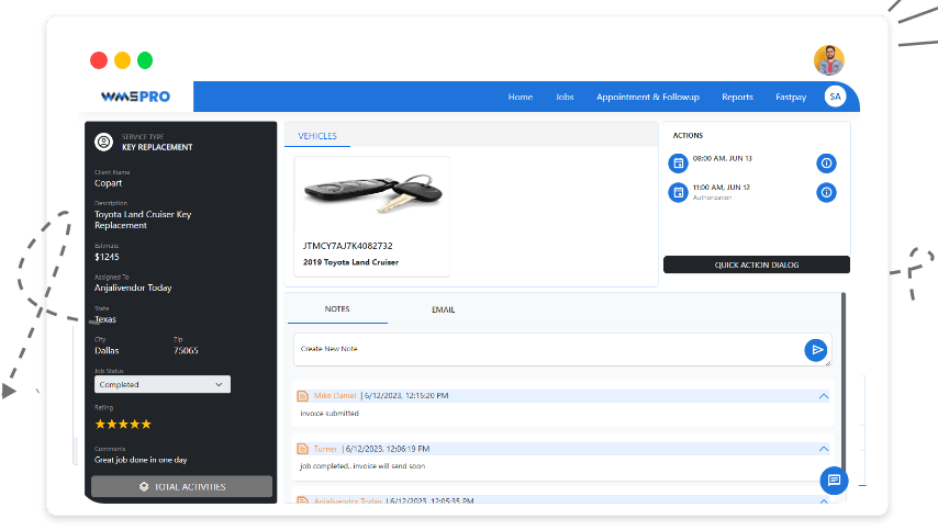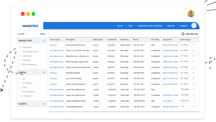 WMS enables customer/client creation, real-time tracking, and assignment of work orders, improving efficiency, accuracy, and customer service. It enables text-based communication, alerting, and integration with Fastpay payment system.